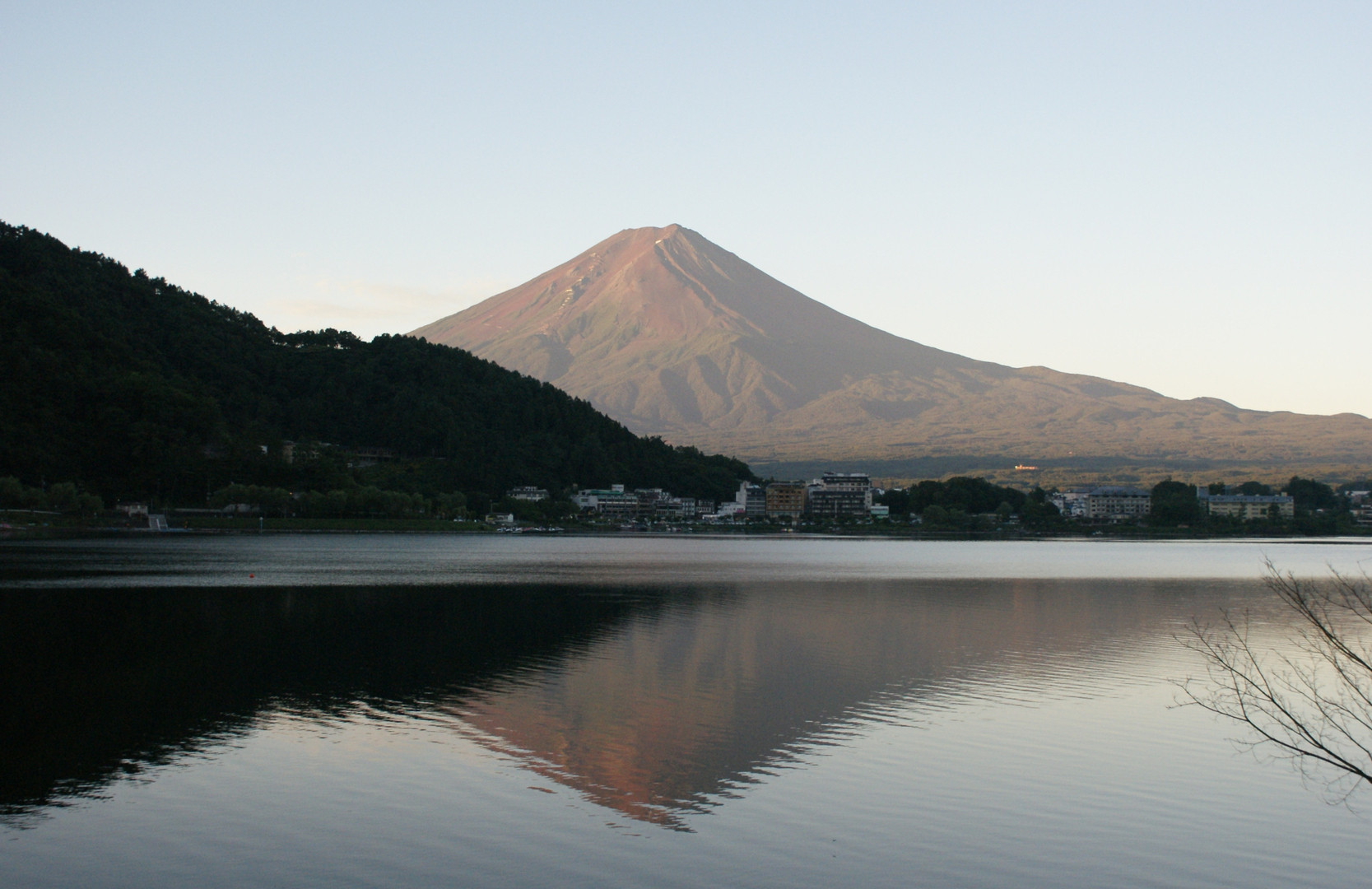 快晴の河口湖と富士山です。 早朝に撮りました。