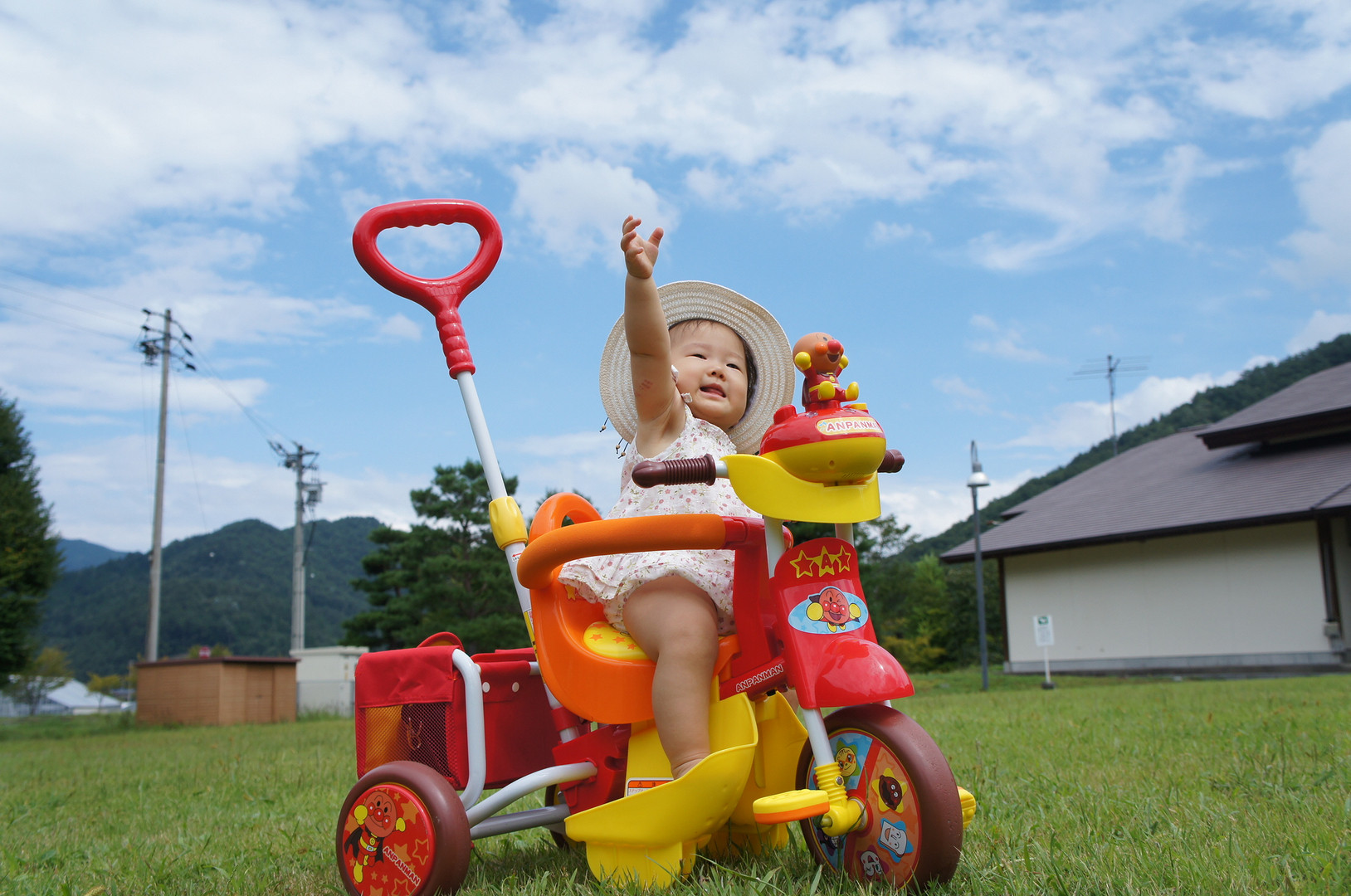 爺ちゃん婆ちゃんに、ちょっと早めの誕生日プレゼントの三輪車を買ってもらって お散歩に出かけた時の一枚! アンパンマン号で出発だ~って言ってるのかなぁ♪