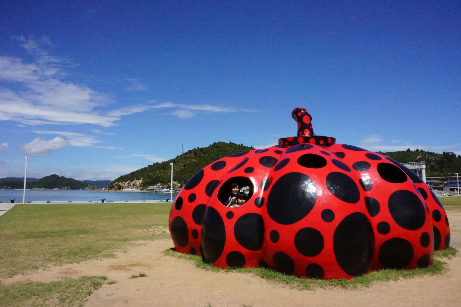直島の港にある有名な赤いかぼちゃ、空との組み合わせが映えます♪