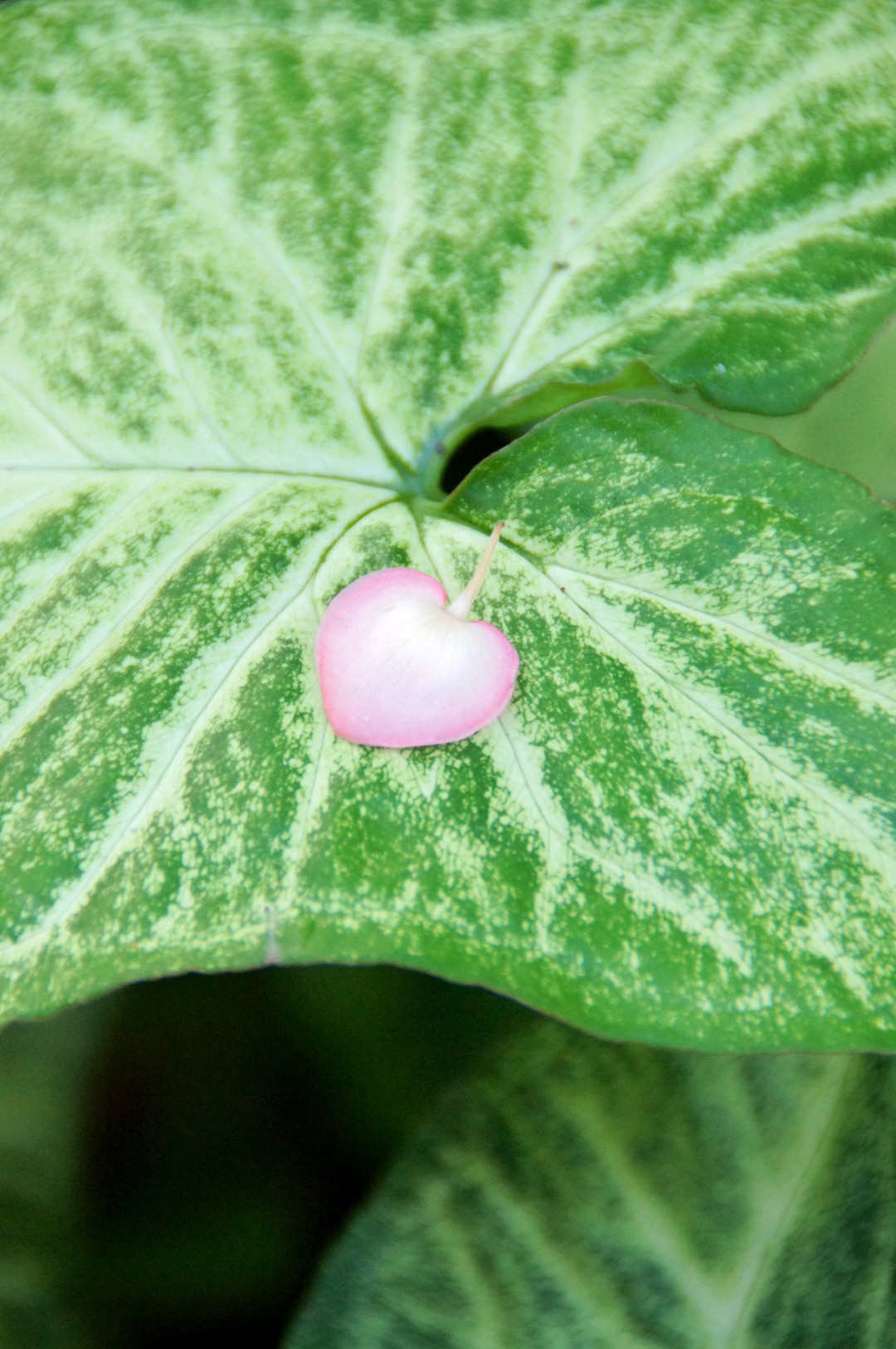 花が散って花びらは地面に落ちる・・ そんな中で ラッキーにも大きな葉の上に散った花びらは まるでハートのペンダントのように光っていました。