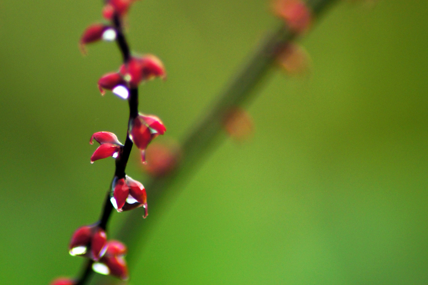 雨上がりの水滴に包まれたつぼみを撮影しました。 風で被写体がブレてしまったので、苦戦しました。 この写真はトリミングしています。