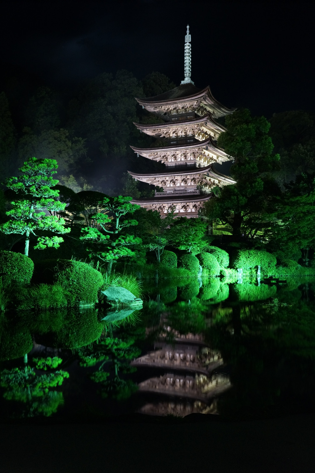 ライトアップされた五重塔を撮ってみました。手前の池に映った姿も綺麗でした。