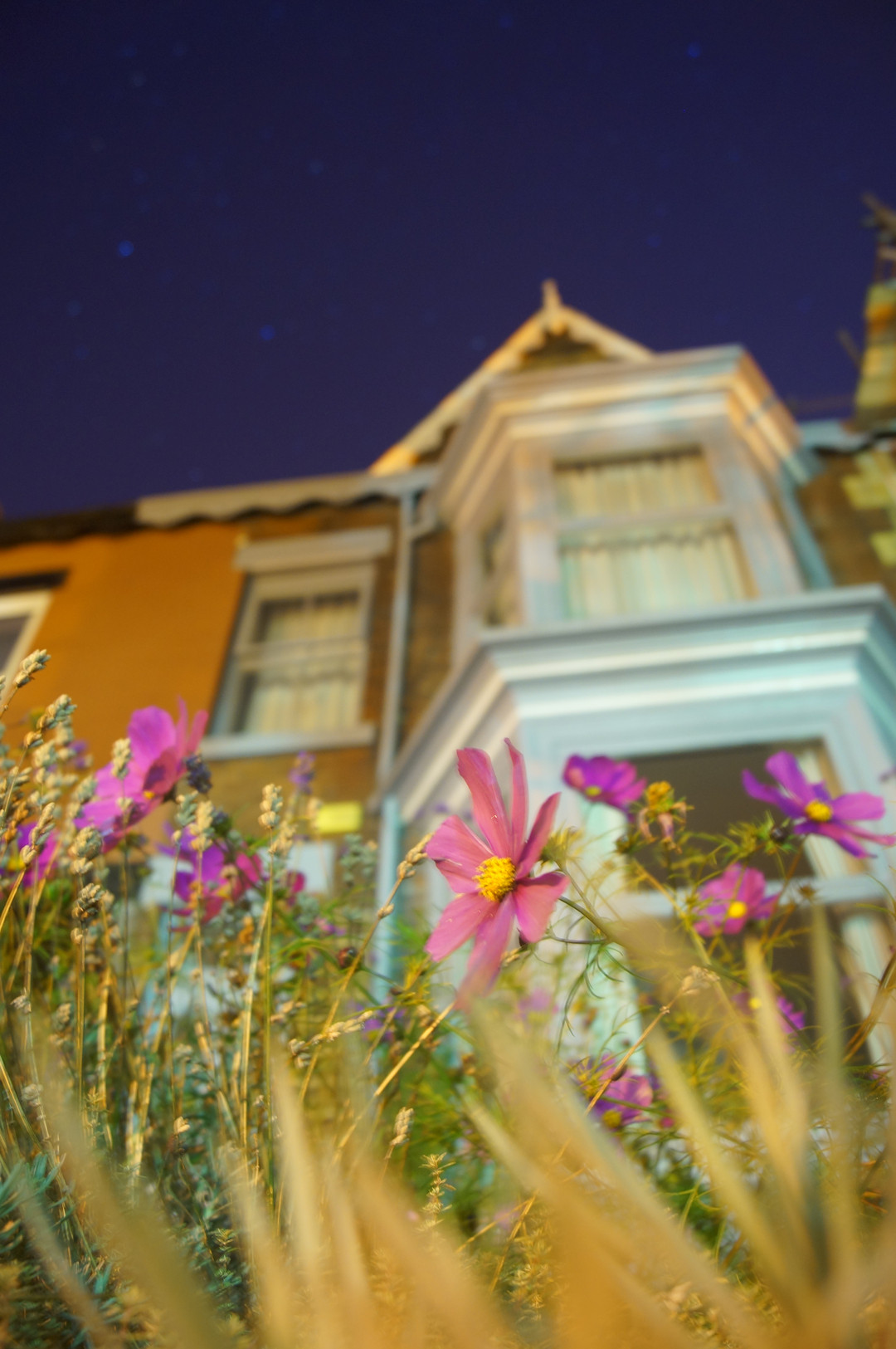 イギリスはサウスヨークシャーのとある町の夜。長屋と星が瞬く空をバックにコスモスが花を咲かせていました。