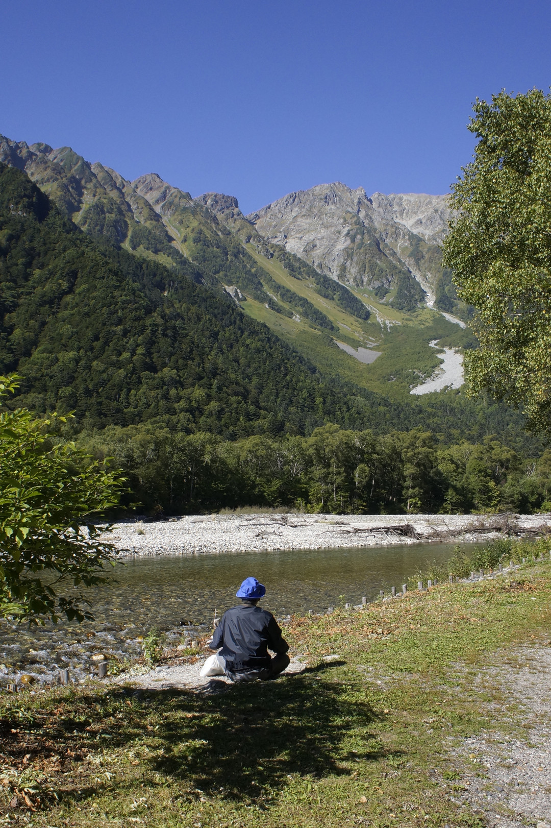 上高地、人込みあふれた河童橋から離れたキャンプ場で一人ぽつねんと 身じろぎもせずに穂高の景観を眺めていた人がいた。 こんな境地同感である。