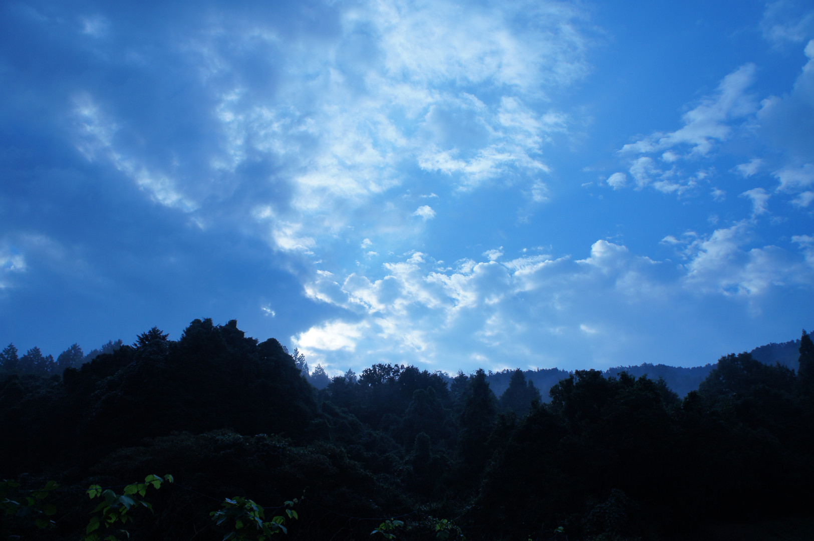 雲間から差す光を強調したくて、木々の色を極力暗く抑えたら灰色の雲まで青くなって、秋の朝のひやっとしたイメージになりました。