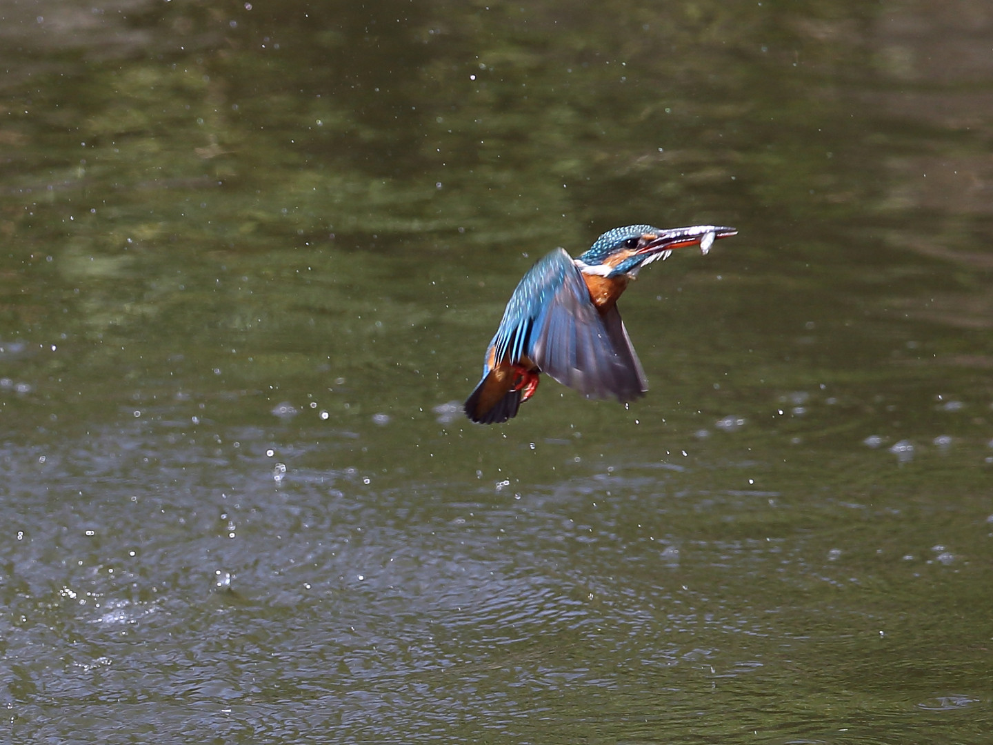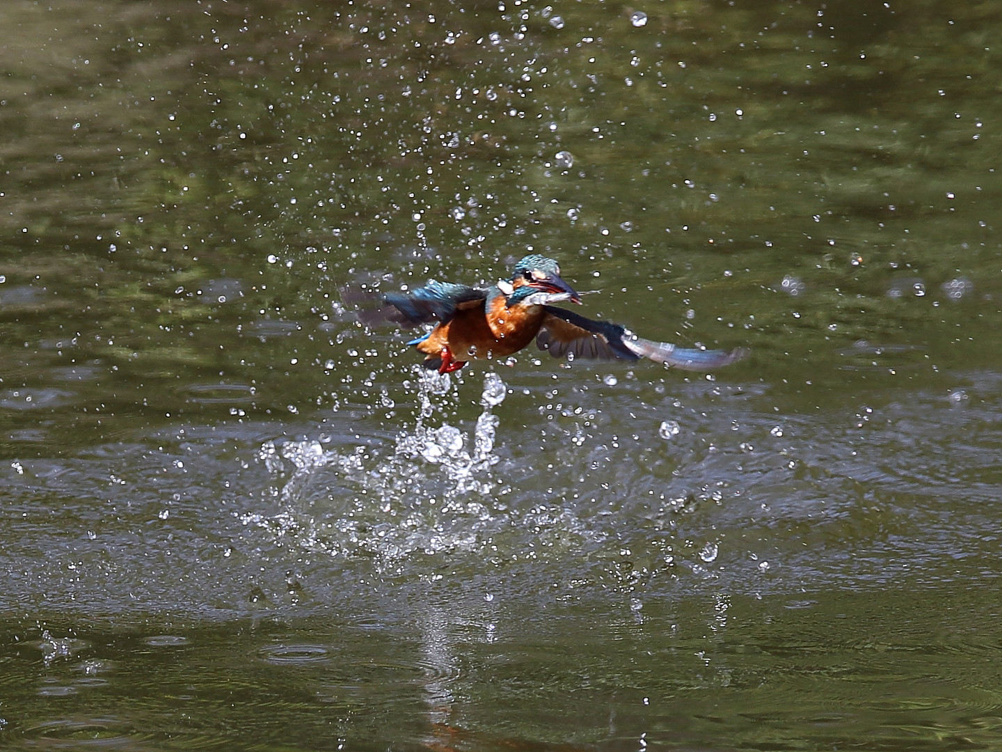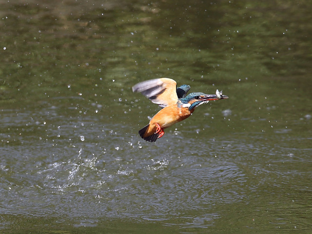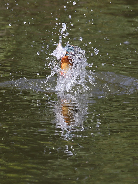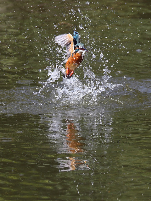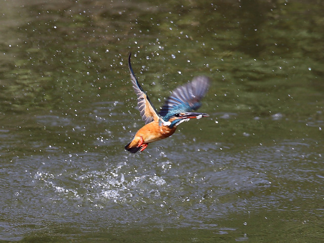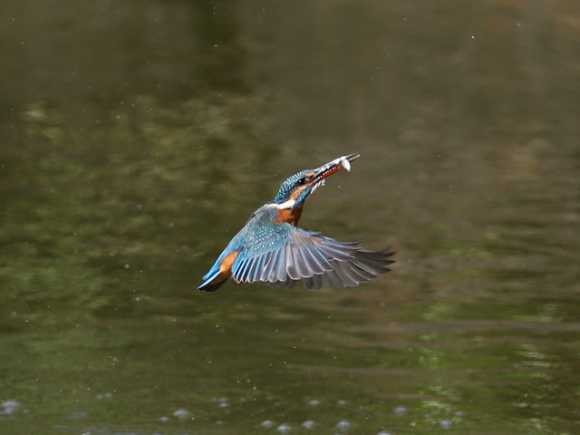 前回の写真では、カワセミくんはお魚無しで水から飛び出してきましたが、今回はしっかり獲物を咥えて飛び出してくれました。(^o^) 私の方もピントを合わせる事ができ、上に飛んでいく途中もなんとか追従できました。 奮発して7連写で~す。(拡大するとピントが甘くなりますが…大目に見てね) 結構トリミングしてます。