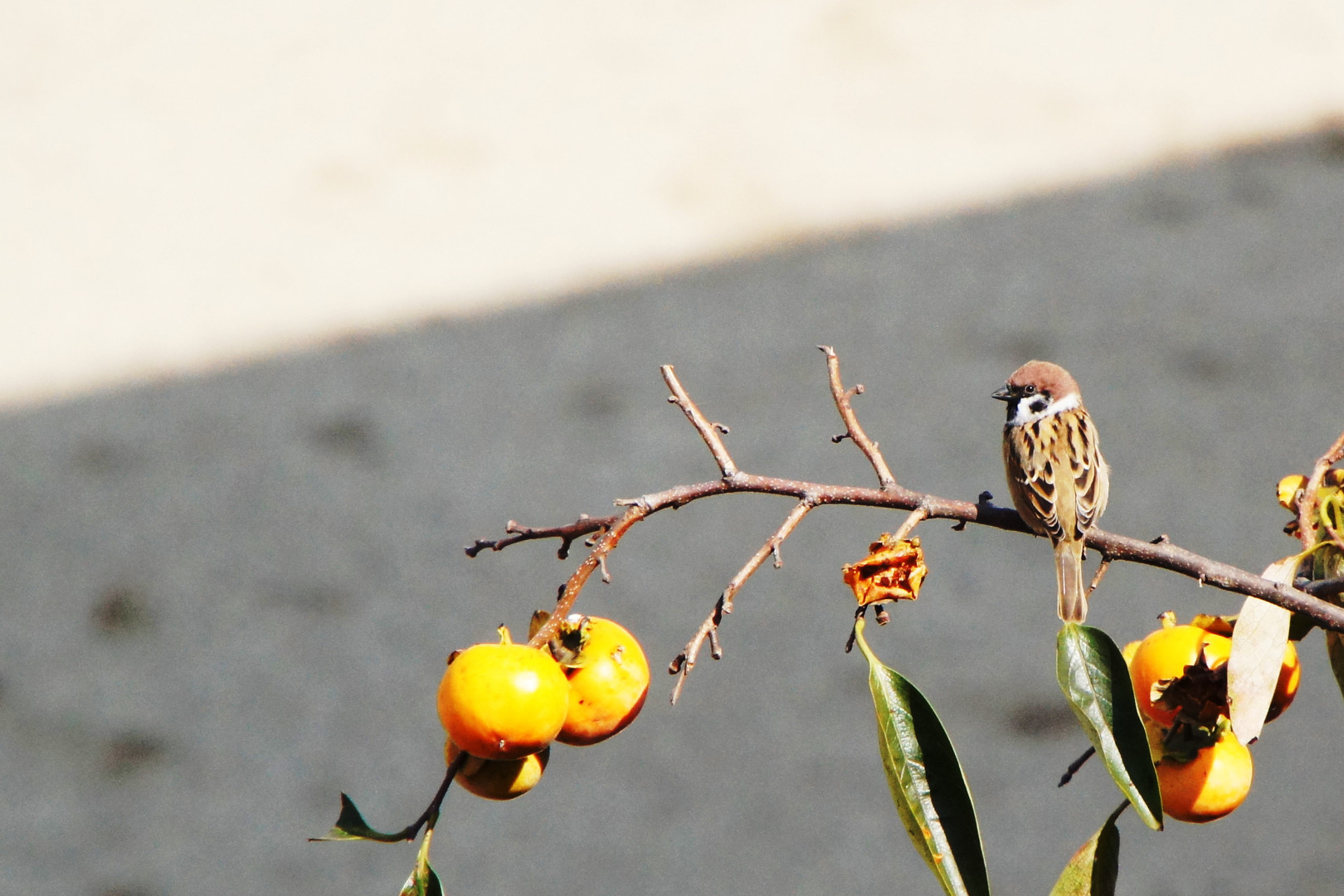 柿の木に雀の鳴き声がしたので見てみると、柿をついばんでいました。