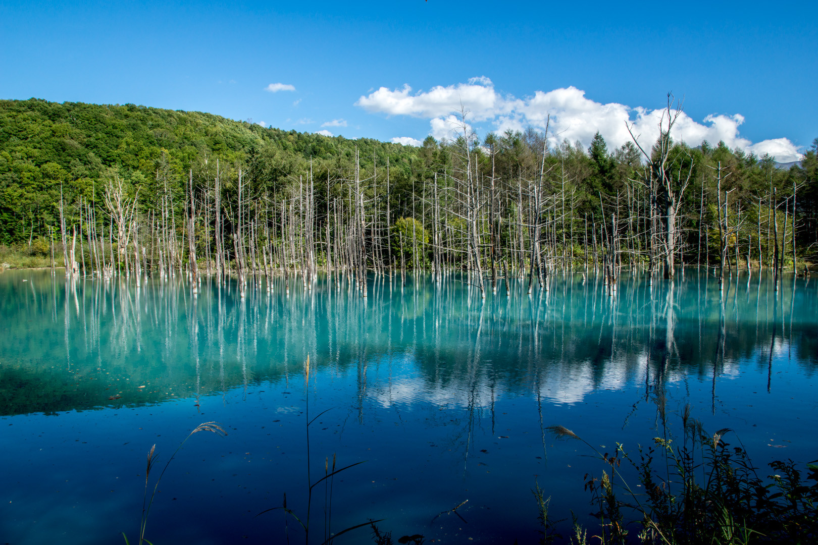 美瑛の青い池です。 変わった水の色もさることながら、空の青と水面に映った空の色と相まってとても綺麗でした。