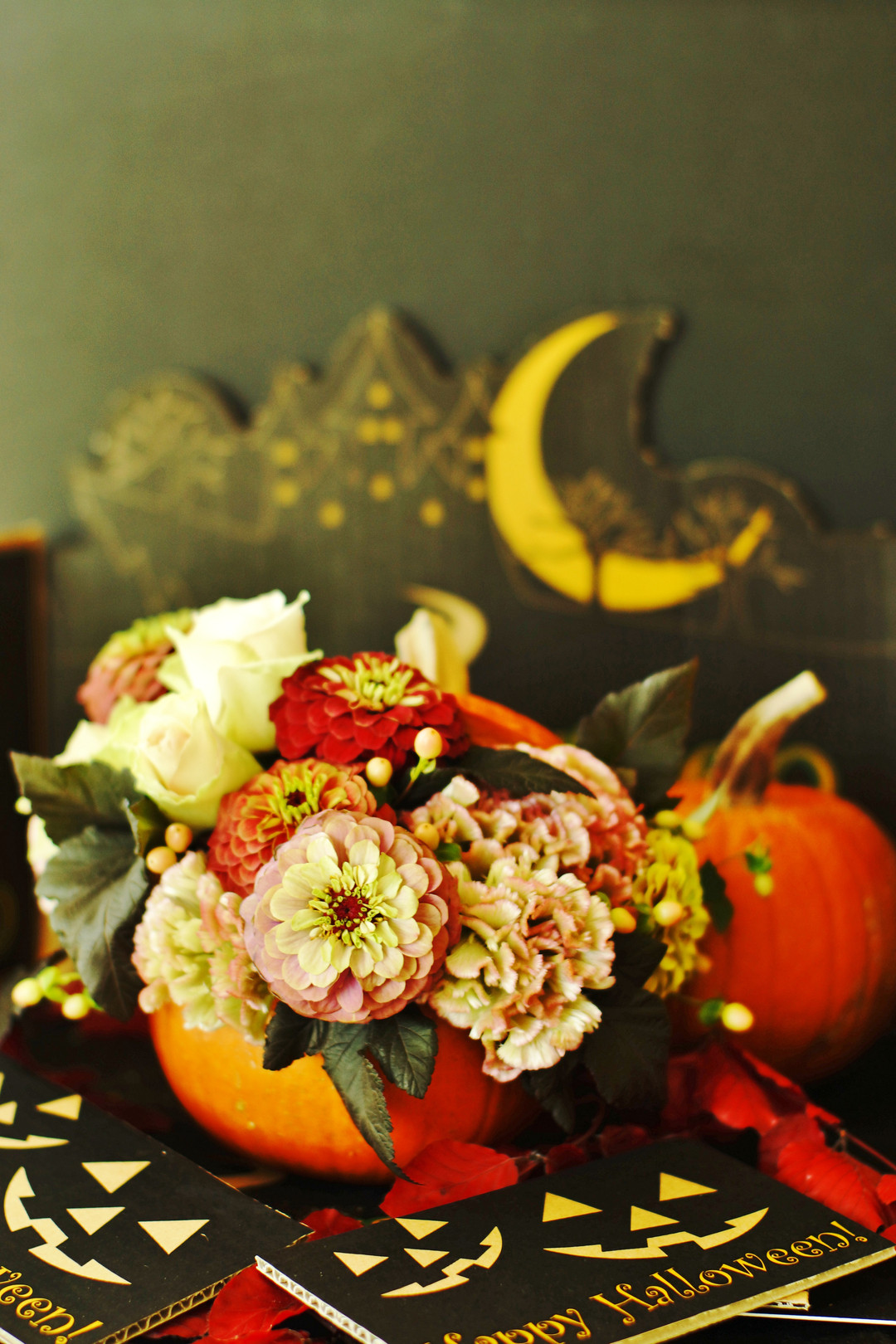 1か月振りの お花の教室 ハローウィンにちなんで おもちゃかぼちゃを器に見立て アンティックな色合いのジニアを中心にアレンジしてみました。オールドレンズ Voigtlander nocton 50mm1.1の特性を生かし 絞りを開放から少し絞ってF1.4で撮影しました。なかなか難しいですね。ソフトフォーカスを掛けてもよかったかなと思います。