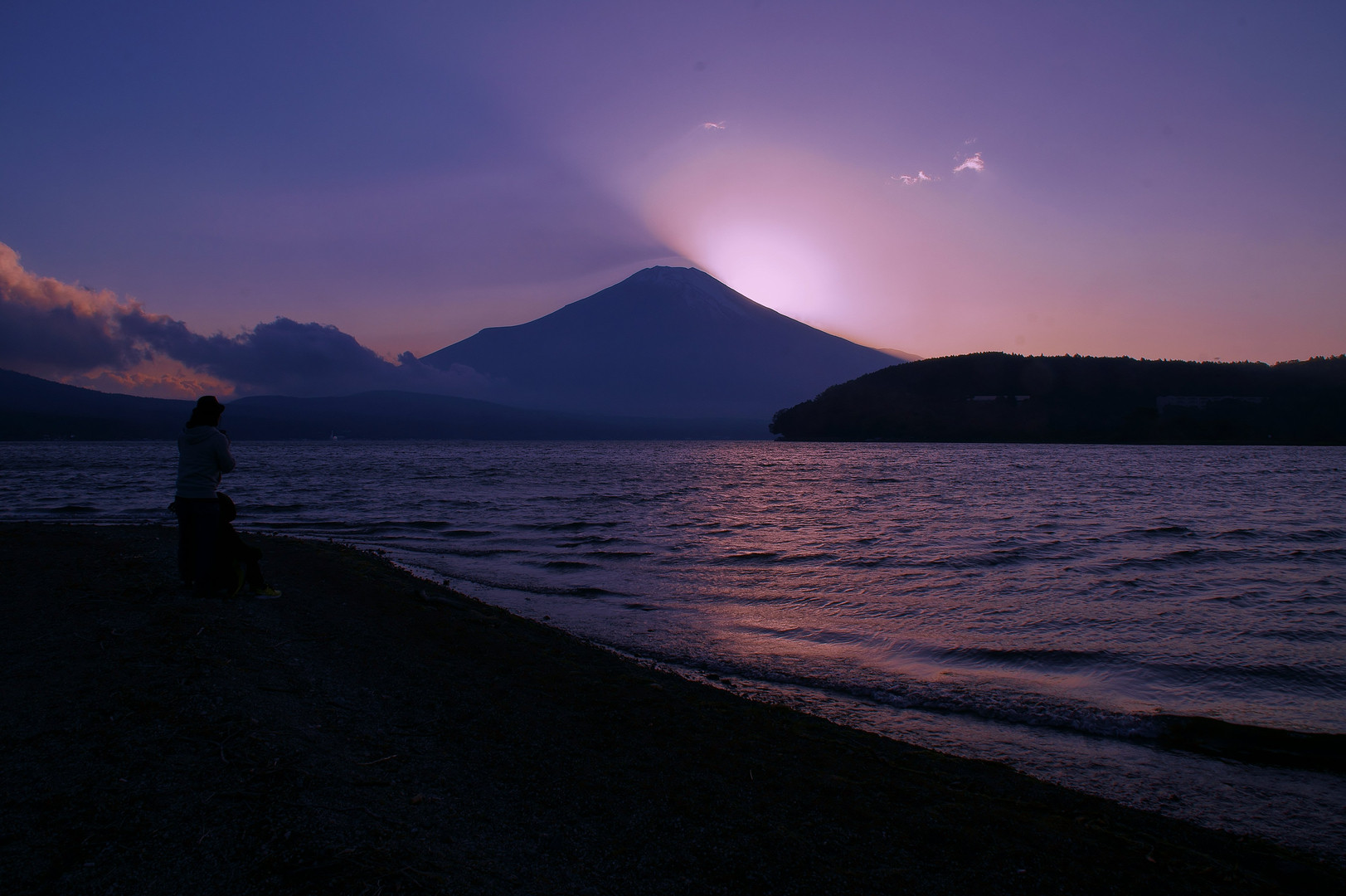 山中湖で夕暮れになり、富士の向こうに太陽が。 光線が不思議な感じでした。