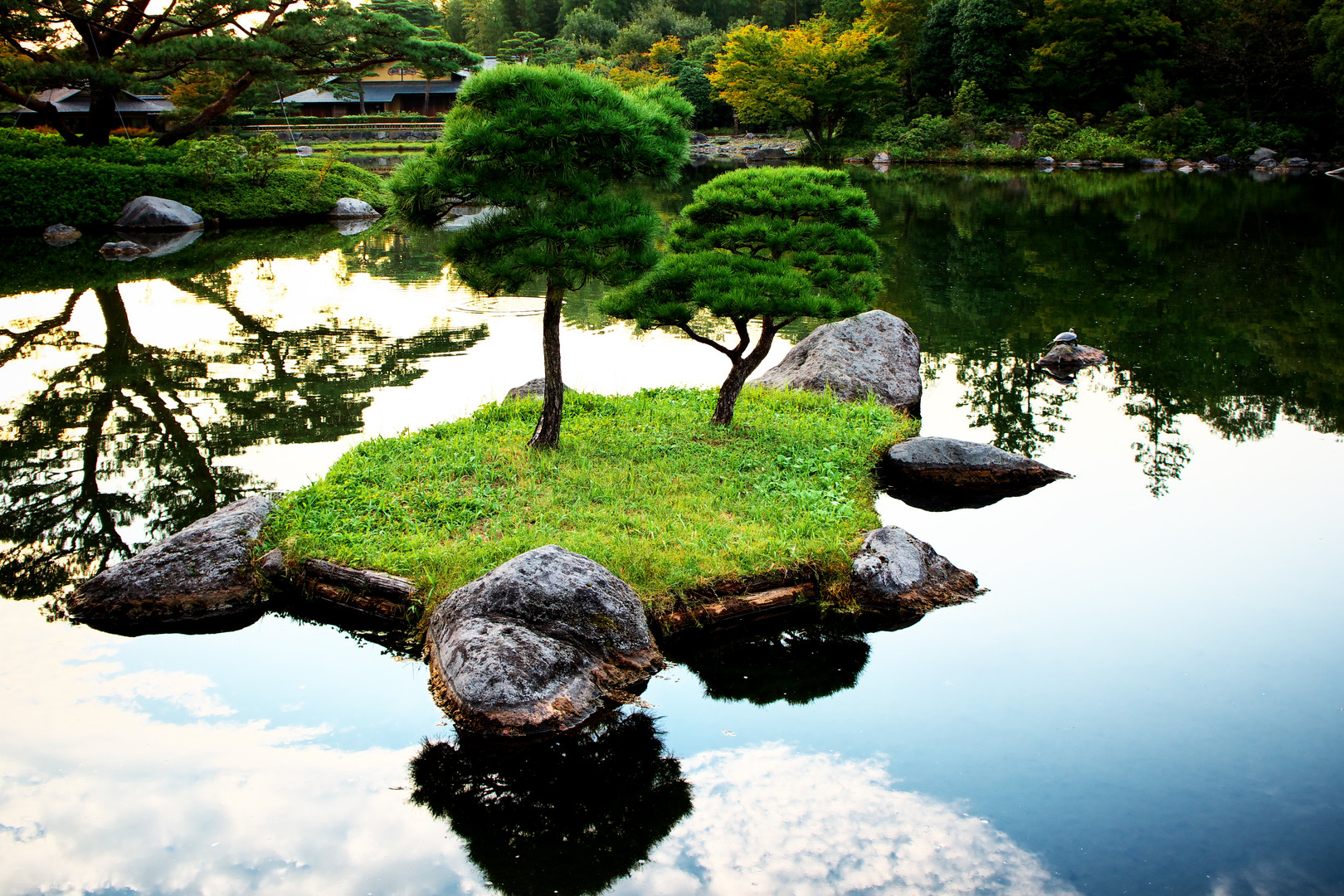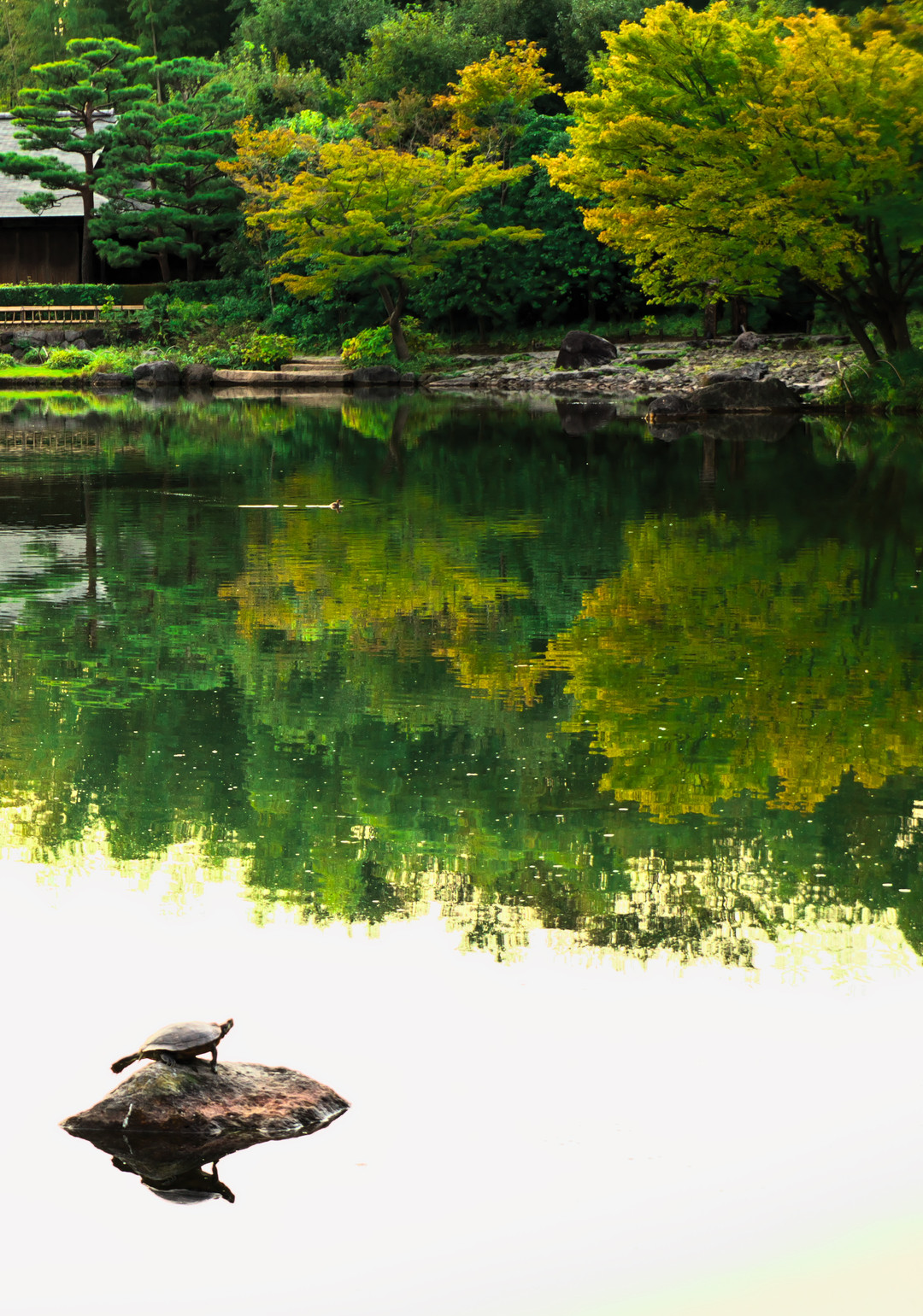 日本庭園と亀・・・お約束(笑)まったくの無風で池が波立つこともなく穏やかな秋晴れを、日本庭園の亀も満喫していたのでしょうか。微動だにしませんから、被写体ぶれの心配はありません(^^;