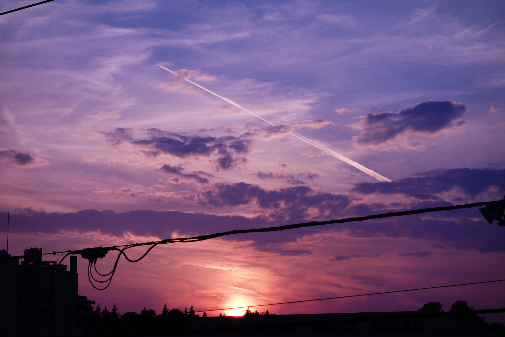 今日も奇麗な夕焼けだったので、カメラを構えたら飛行機雲が・・・ しかし、目の前に電線が・・・・(^^;
