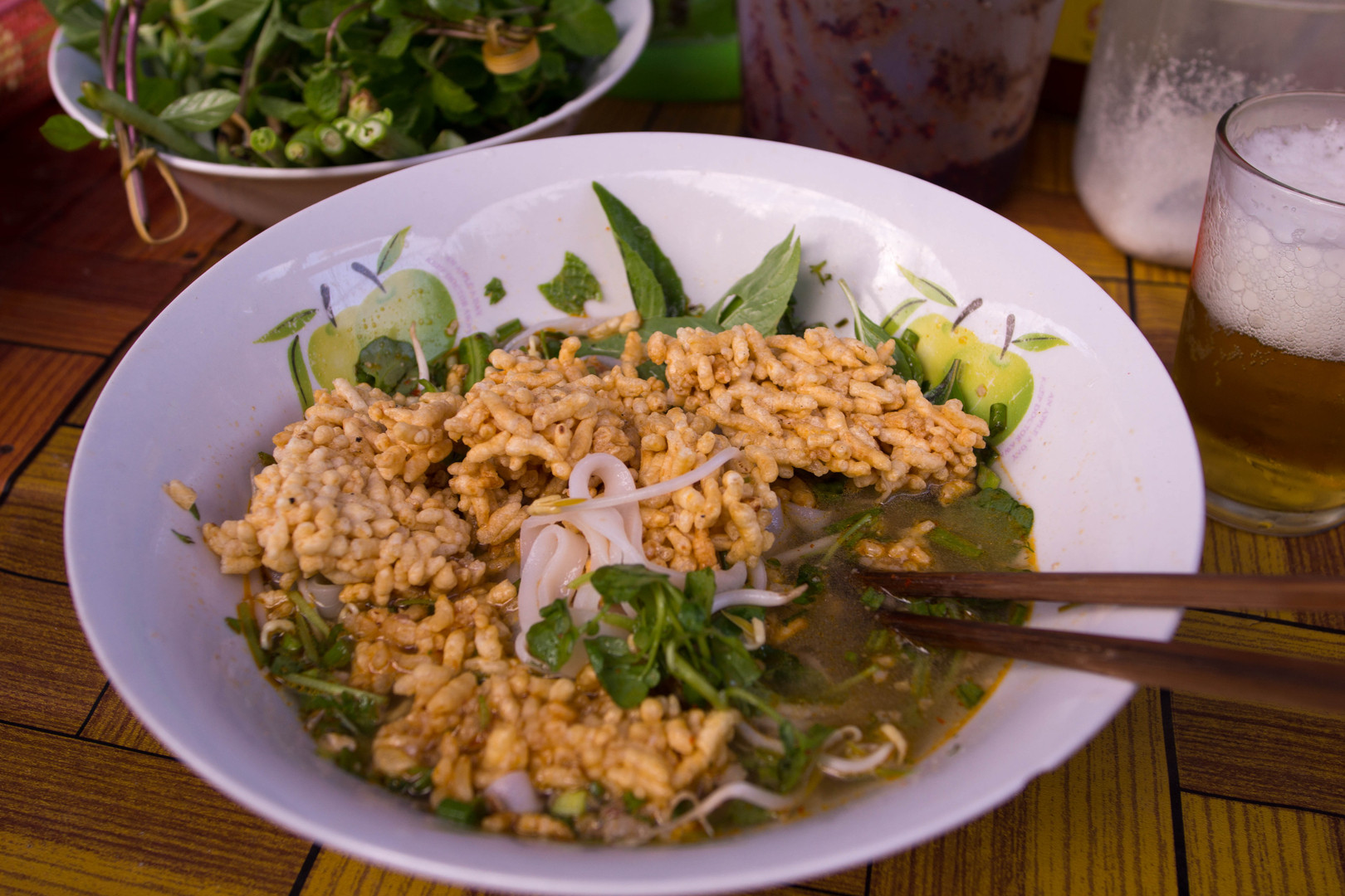 ルアンパバーン名物の肉みそ米麺。 付け合わせの生野菜、ハーブをたっぷり入れ、さらにおこしを割りいれて食べます。