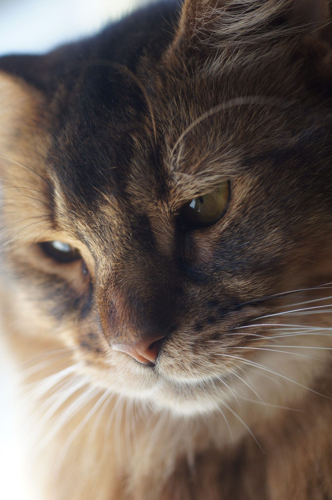 たまたま窓際にいたジョン君をパチリ。偶然過ぎますが、寒気を感じる、ドキッとするような一枚が撮れてしまいました。光の当り具合なのか、彼そのものの表情がいいのか、この眼差し,ワイルドな感じに痺れてしまいます。こんな優しいのかワイルドなのか 可愛いのか分からない彼に毎朝毎朝、五時半耳たぶを噛まれて起こされます。
