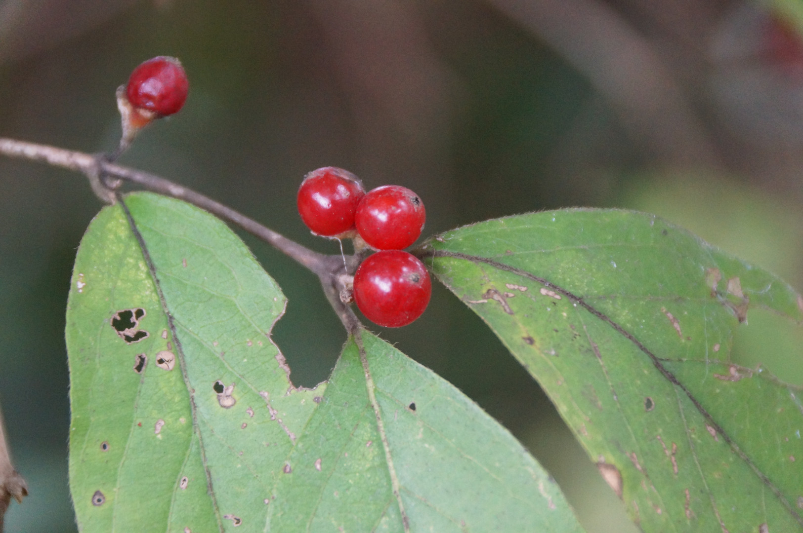 ハナヒョウタンボクの実です。花は白色で春はミツバチが多く訪れます。しかしこの季節にこの果実は野鳥に見向きもされません。