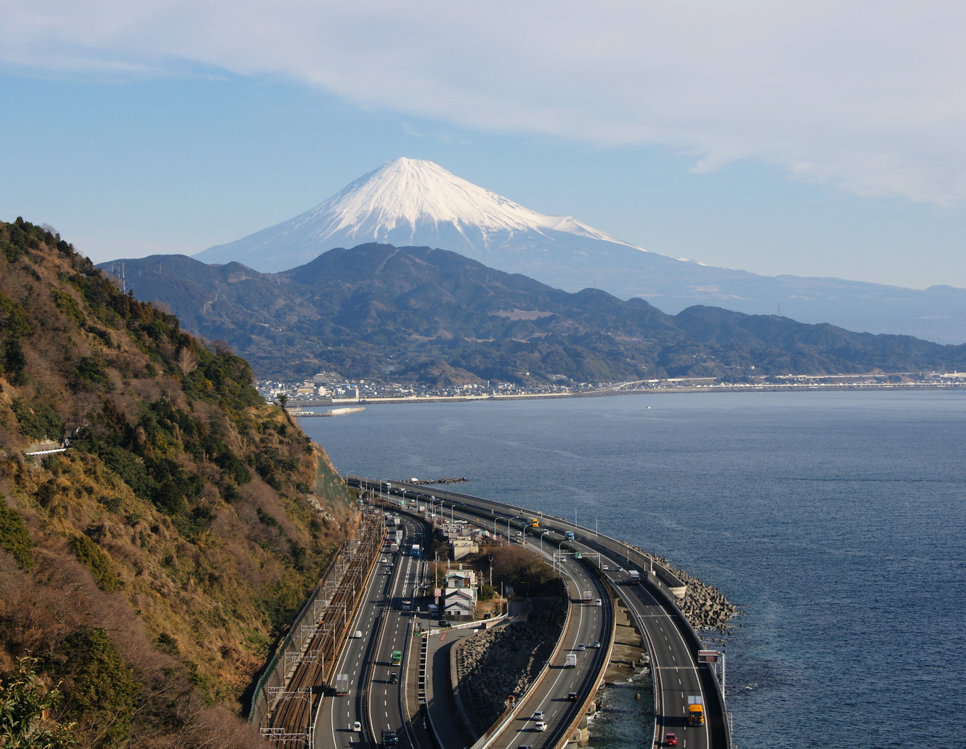 静岡の由比から見た高速道路と富士山です