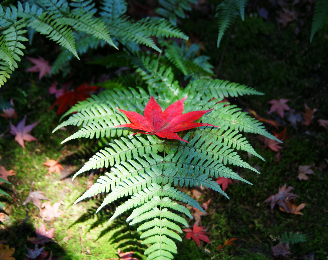しだの緑と赤いもみじの葉の対比にひかれました