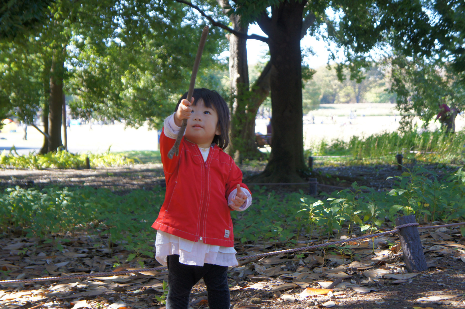 公園で木の棒を見つけて遊んでいる、うちのお転婆娘です。