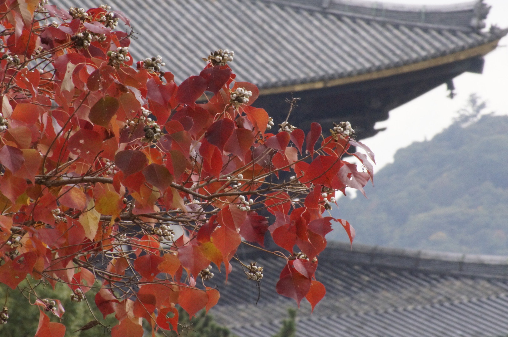 東大寺大仏殿を背景に 大仏池の周りの紅葉
