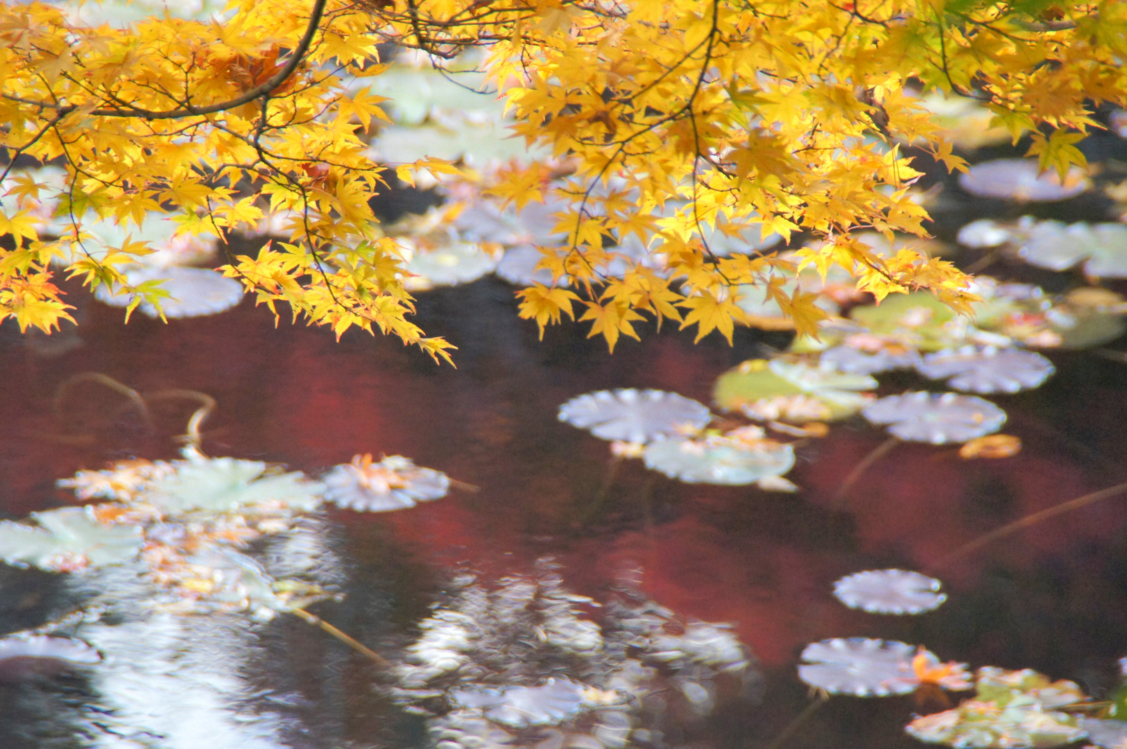 陽射しに当たって黄金色に 輝くと紅にも劣らず綺麗です。 池には 紅の紅葉が映っています。