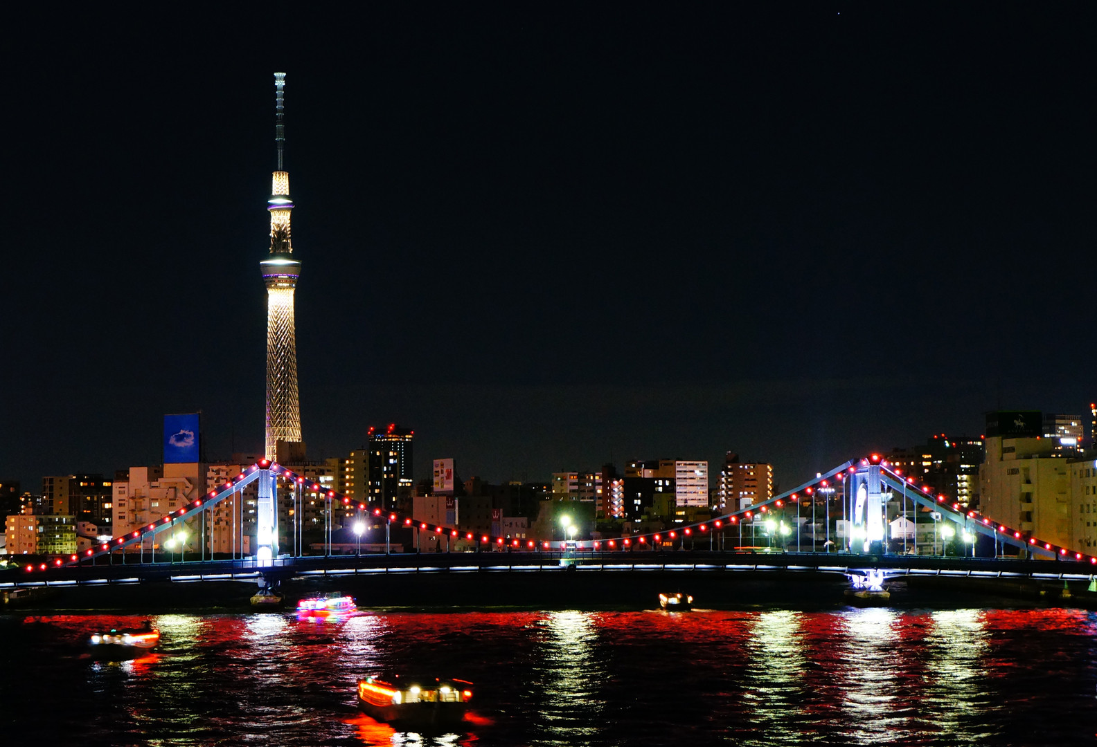 隅田川大橋から清洲橋をバックにスカイツリー。 清洲橋のライトアップはピンク色!でした。