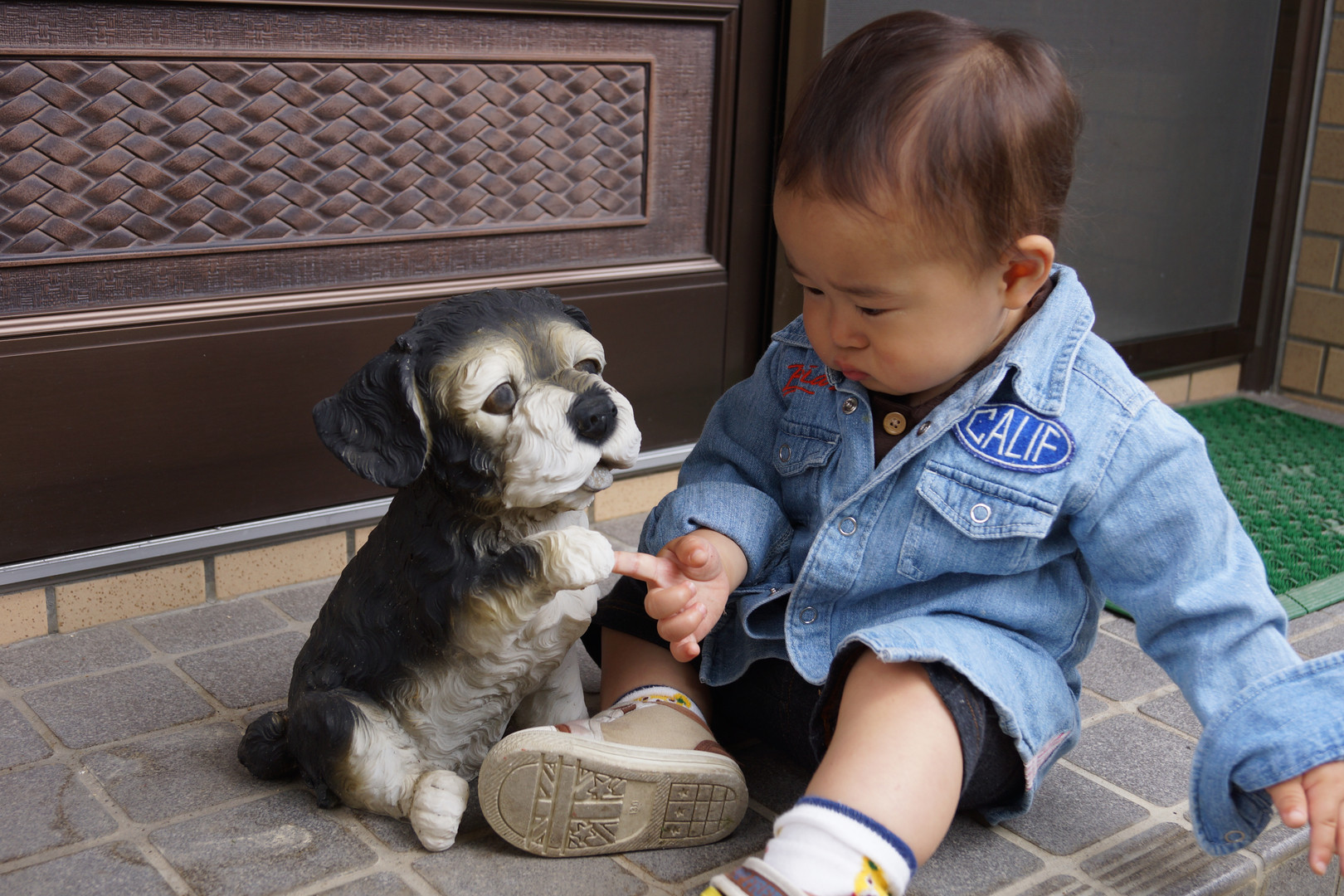 久しぶりにやって来た孫。玄関の犬が気になるようです