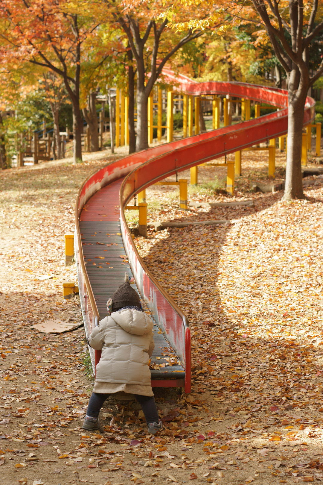 公園で遊ぶわが子。すべり台よりそこの落ち葉が気になったみたいです(笑)