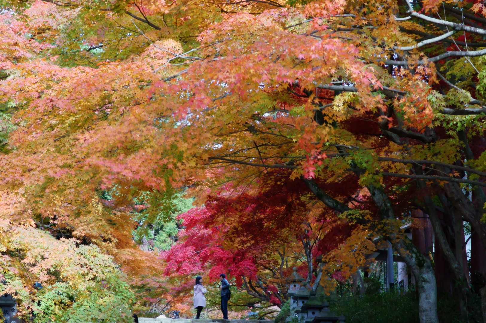 胡宮神社、血染めの紅葉の下のカップル