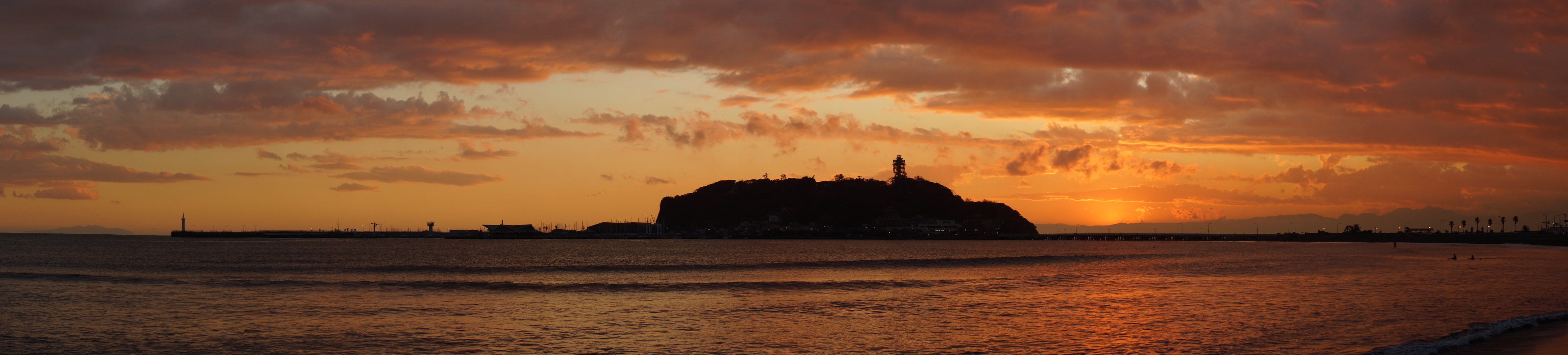 少し雲が多めですが、いい具合に赤く染まったので、パノラマ撮影してみました。 パノラマ撮影、波が入ると、ギザギザになってしまったり、水平を意識しながら撮るのが、結構大変ですね。
