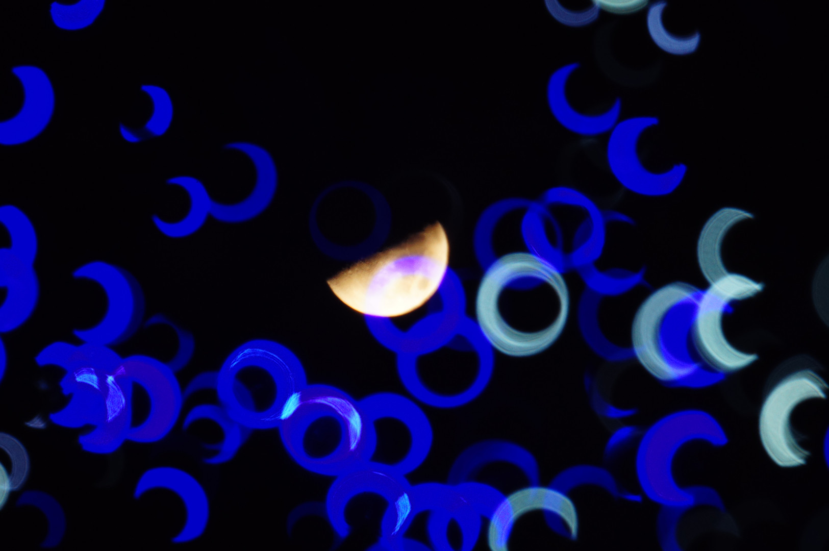 クリスマスイルミネーションの間から見えていた月を撮ってみました、 寒さで手が悴んできていたので、手振れが心配ですw
