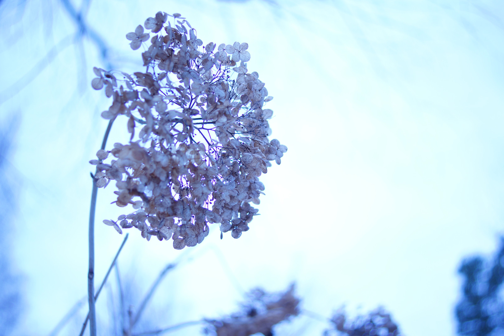 静かな雪の中で、枯れた紫陽花が輝いていた