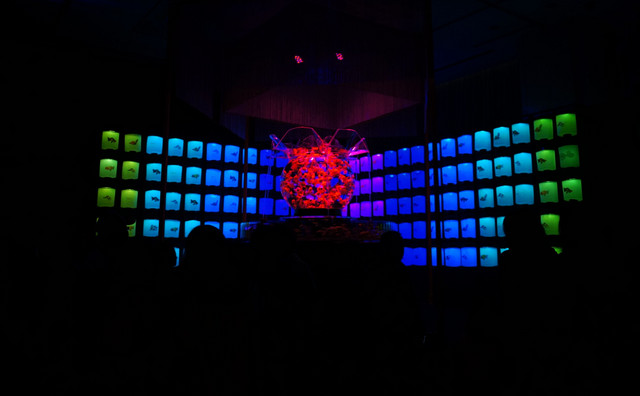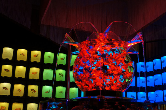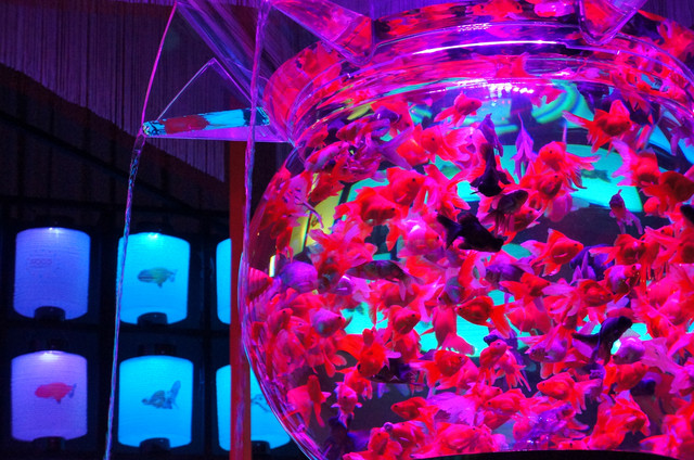 初めて、 アートアクアリウム展へ行って来ました。 直径約1.5mの金魚鉢に1000匹もの金魚が泳ぐ 『花魁』 はライティングが綺麗でまるで異空間へ行った気分になりました。