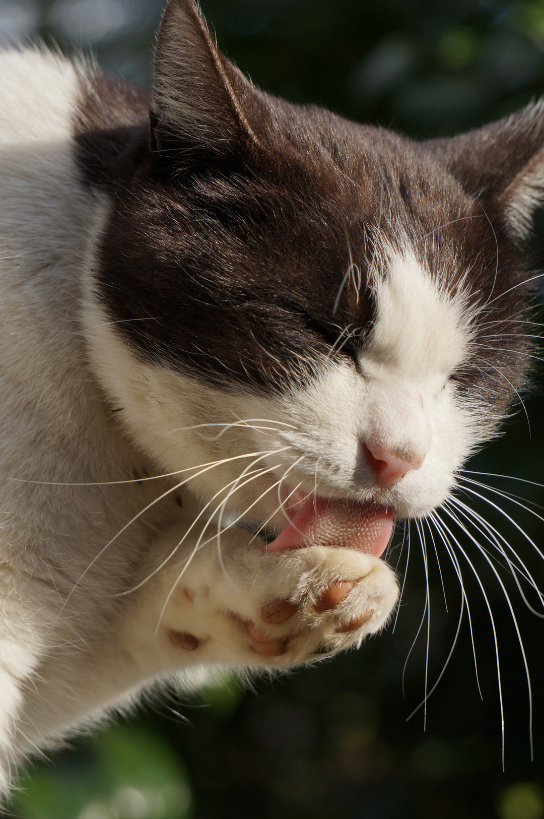 お昼寝から目覚めて 毛づくろい。 彼にとっての至福の時間。 肉球がキュートでしょ?