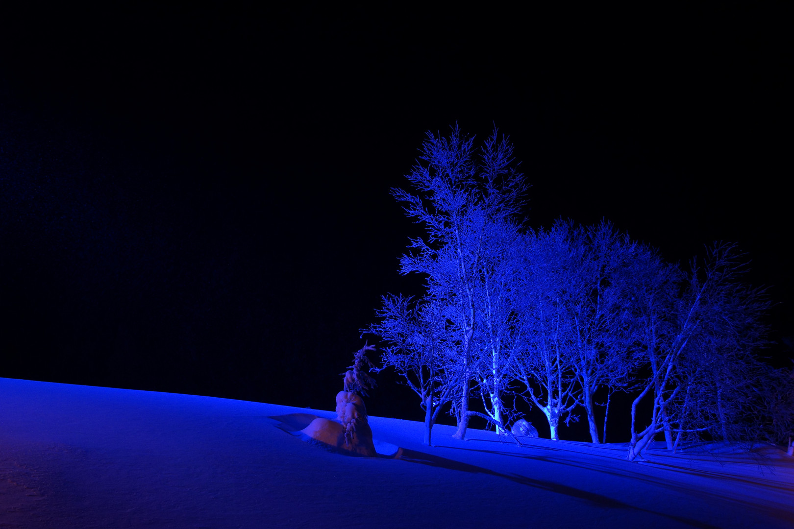 漆黒の夜空にブルーライトで照らされてる木々がなんとも妖艶な感じがしました。 黒と青の対比がきれいかなと思いました!