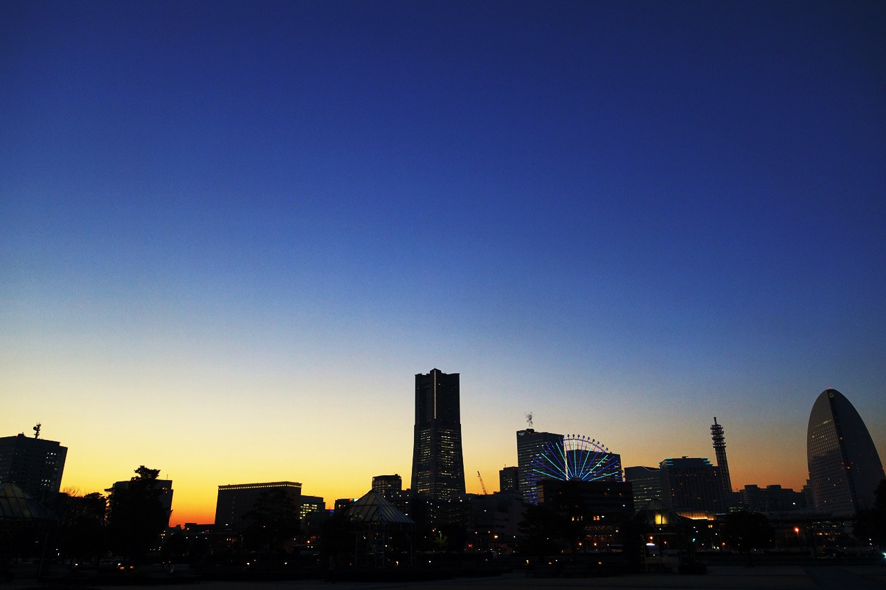 雲一つない横浜の夕景。 ライトアップされた街の綺麗ですが、自然の朱には敵わないかな。