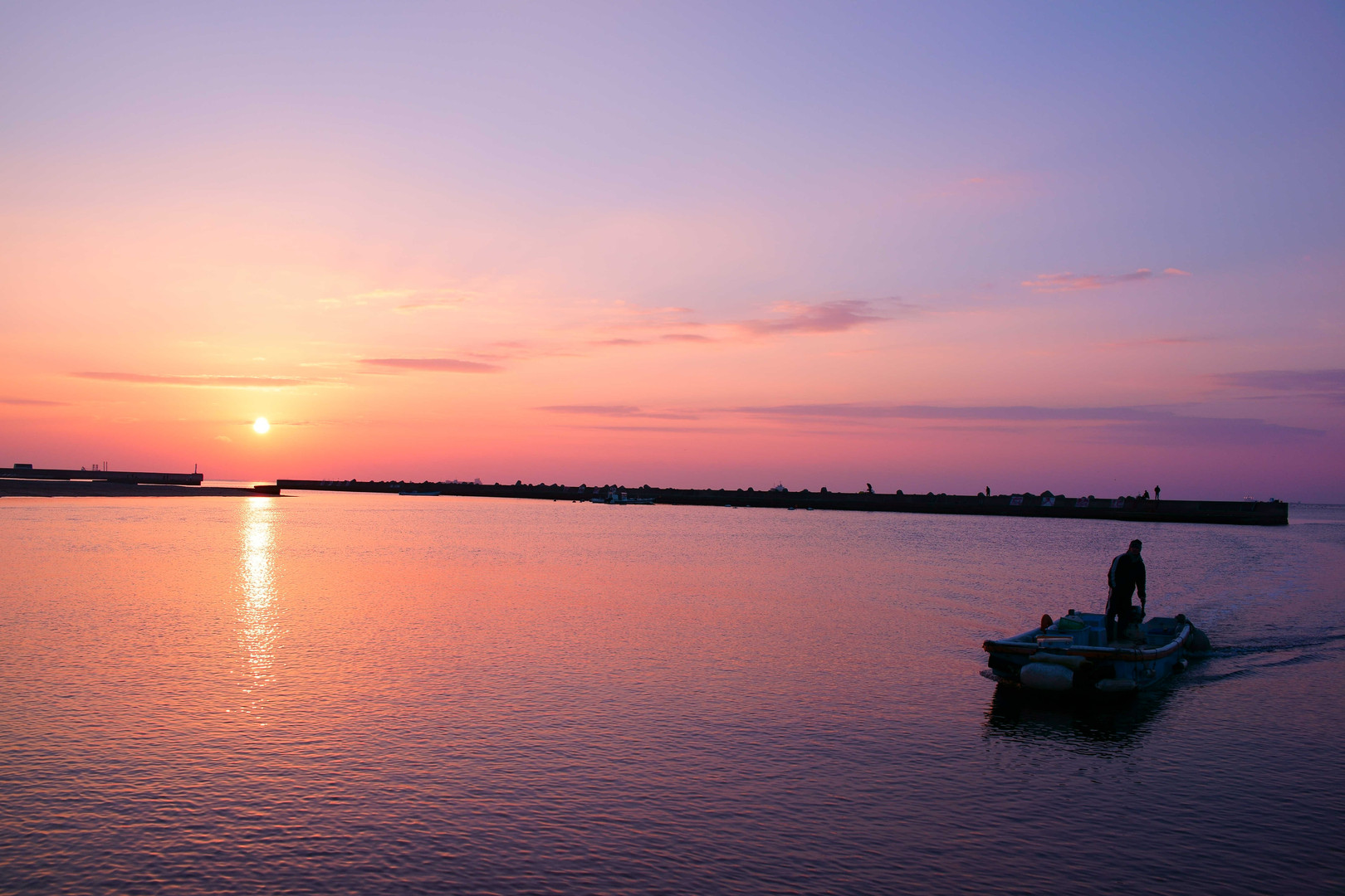 今朝の須磨海岸です。 防波堤まで釣り人を運ぶ渡し船が帰ってきました。