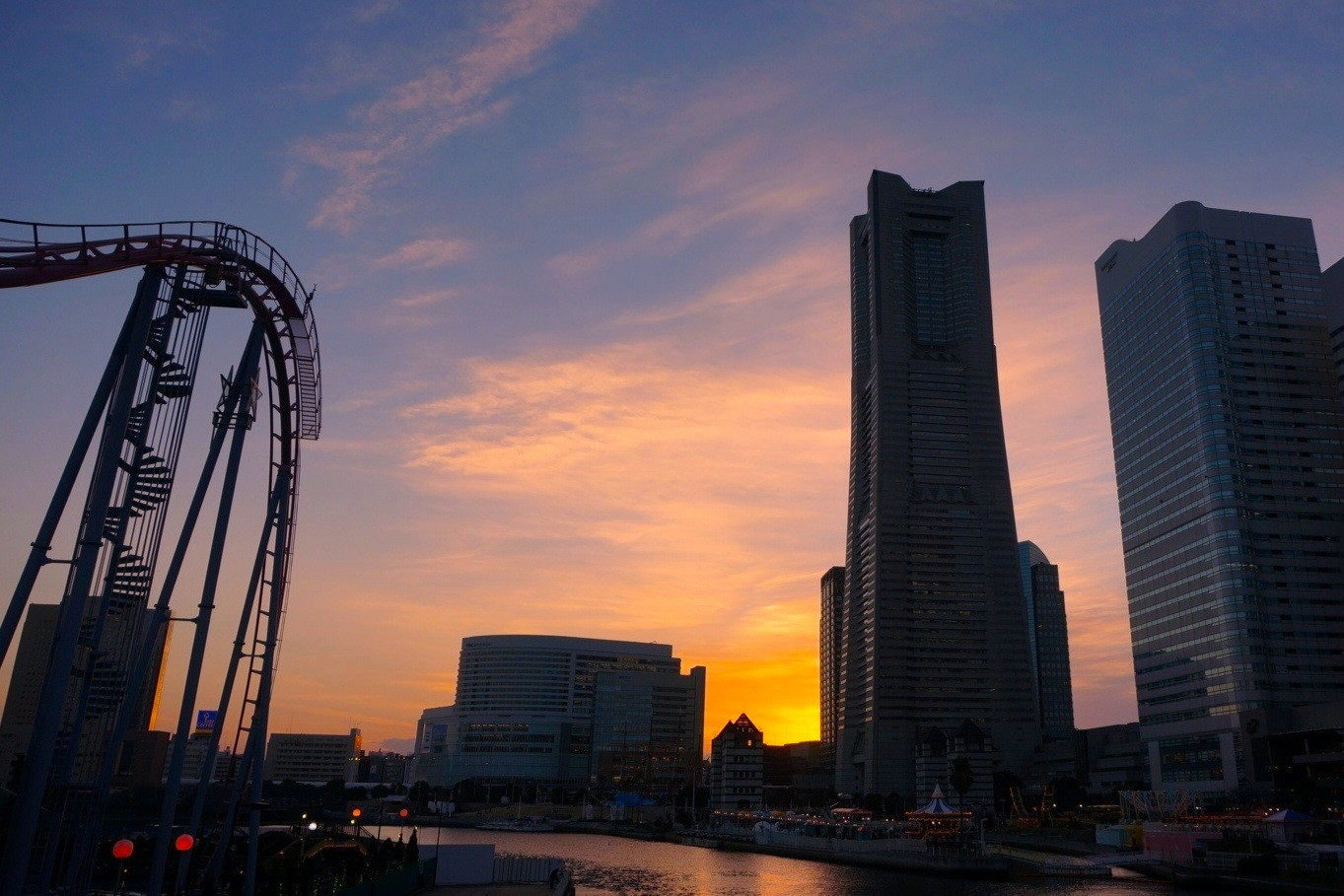 みなとみらいの橋から、オフィスビルとジェットコースターのアンバランスな組み合わせを撮りました。