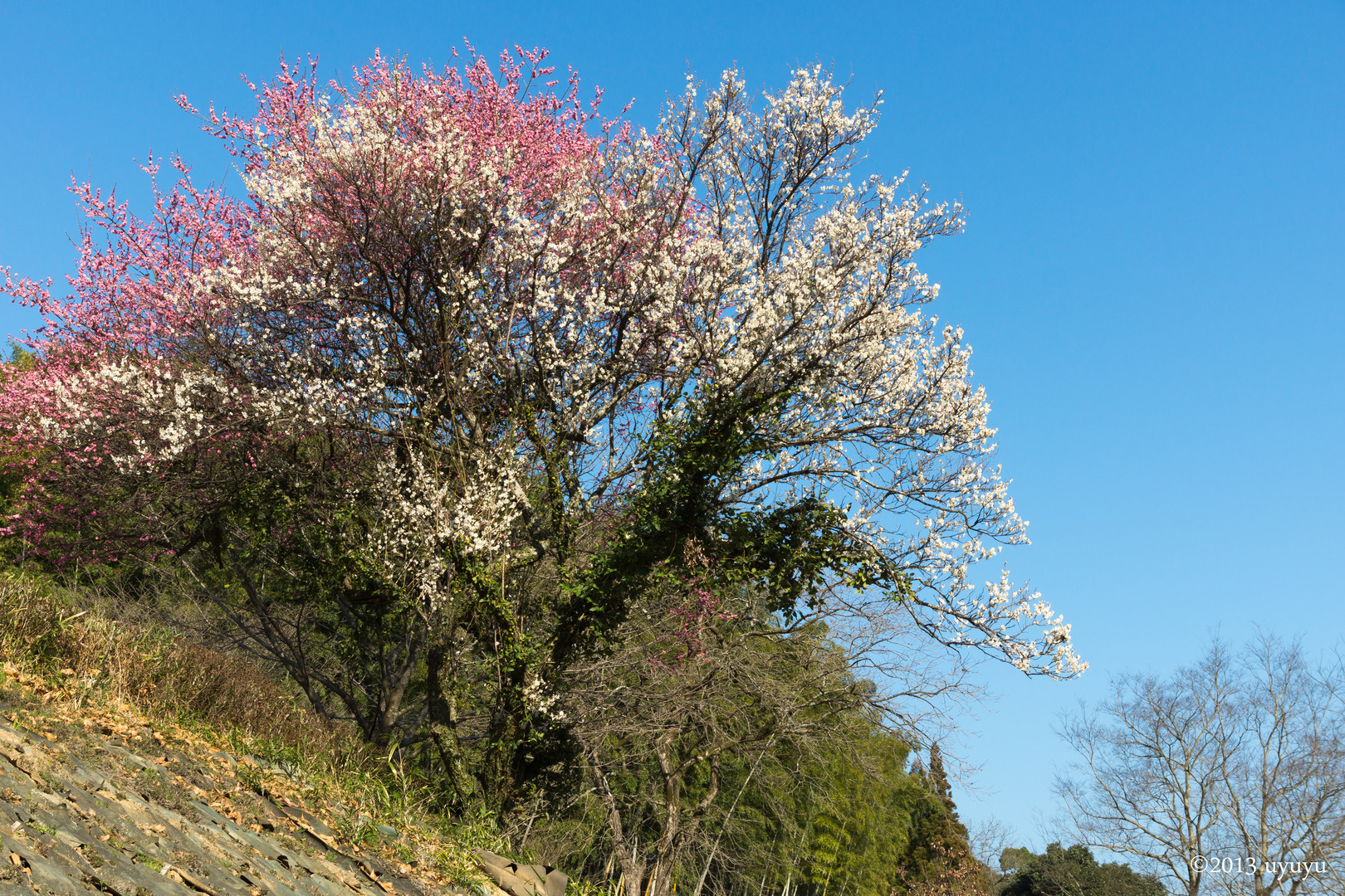一見すると、紅梅と白梅。 でも近づいてみると、根っこは何と一本の木でした! 誰かが接ぎ木したのか、それとも自然のイタズラか… どちらにしても、珍しい梅の木です♪