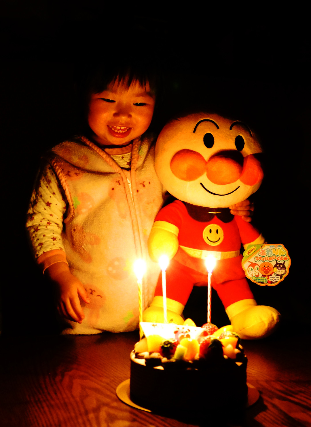 末っ子の3歳の誕生日^^ お兄ちゃんとお姉ちゃんにもらったアンパンマンと記念撮影!!