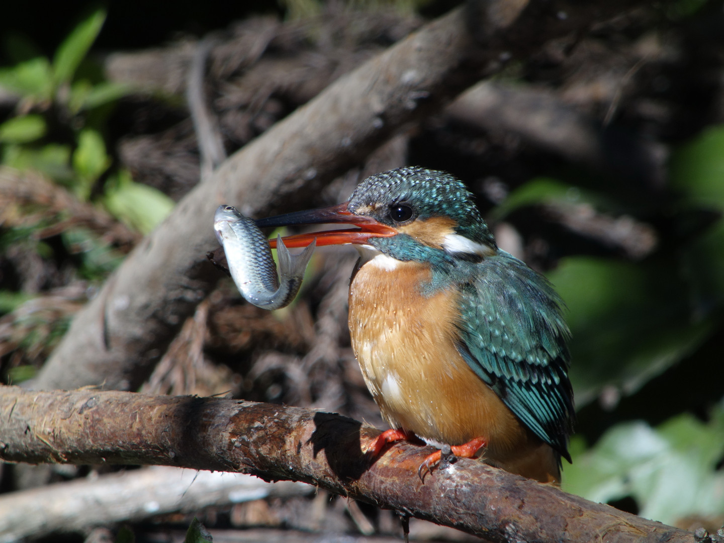 デジスコ撮影。 焦点距離:2997mm、ノートリ。 僕の1番好きな野鳥、カワセミです。 大きな獲物に刺さっちゃってますが、この後 無事食べられました(^^)
