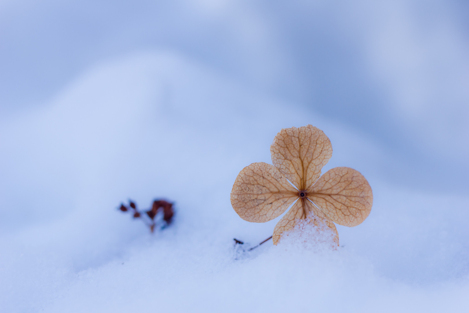 ヤマアジサイの枯れ花が、雪のベッドに 静かな寝息をたてていました。 OLD:Y/Cマクロプラナー60mmF2.8 f2.8 AV WB/太陽光
