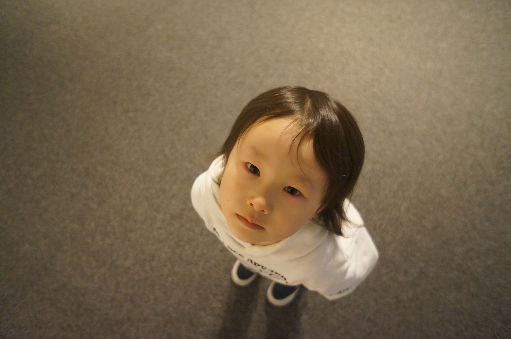 ママの絵画サークルの展示会を見に行ったときに上からぱちりと撮りました。 犬みたいな瞳でジーと見られまして、面白い構図になったと思います。 親バカですが、可愛い・・・。