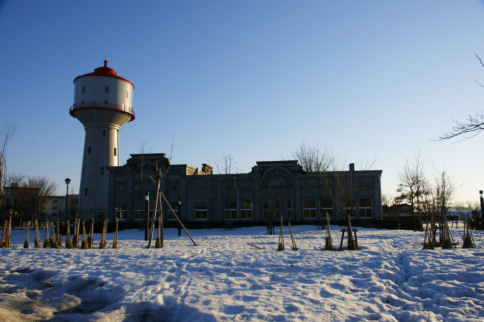 長岡市内にある公園で昔は浄水場の施設だった所を公園として整備され、その名残として水道タンクと建物が今も昔のように現存しています。