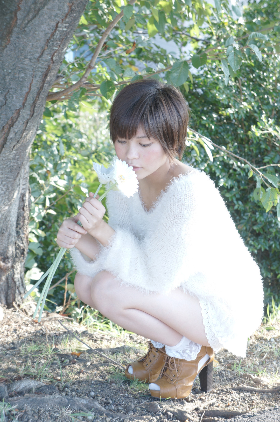 花をじっと見つめる友人。 森ガールを目指してみました