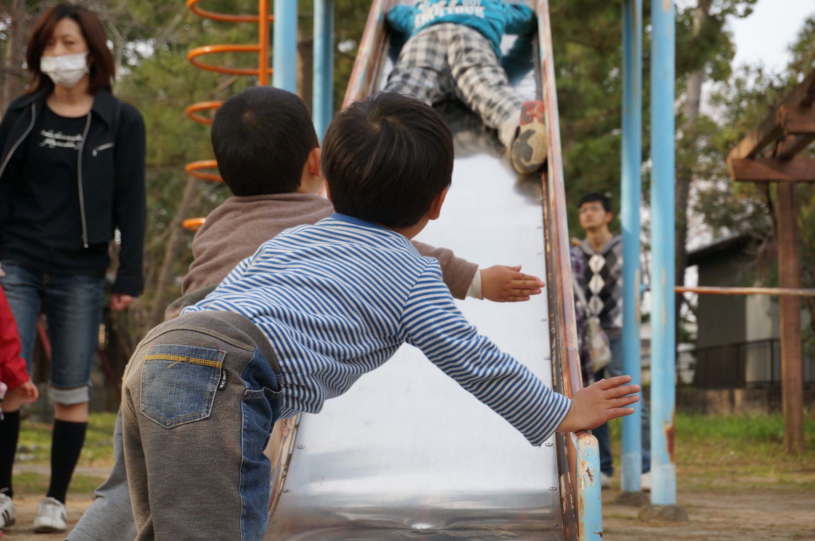 近所の公園の滑り台にて、 上から滑ってくる友達を2人の「遮断機」が待ち受けています。 もちろん、遮断機は通過する時に開きます。 近くに電車の踏切があり、本物に触発されたのでしょうか。