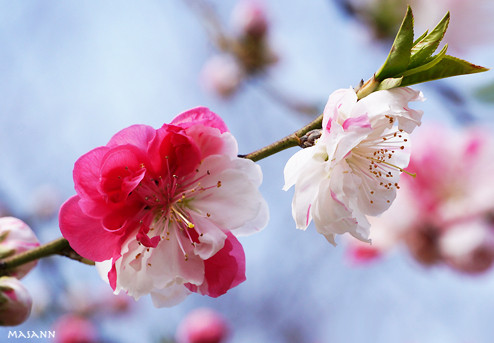 紅白に咲き分けた桃の花。 風で花びらが揺れると歌を歌ってるようで。。。