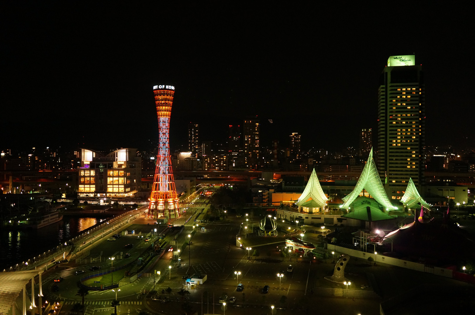 神戸メリケンパークオリエンタルホテルのバルコニーから撮影した、ポートタワー方面の夜景です。