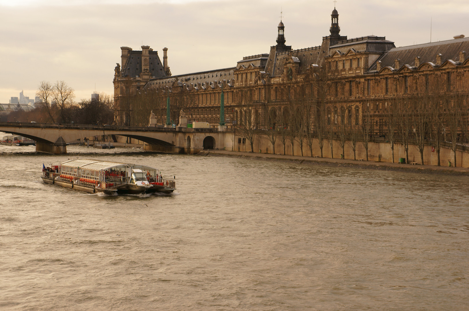 夕日に照らされるセーヌ川と遊覧船