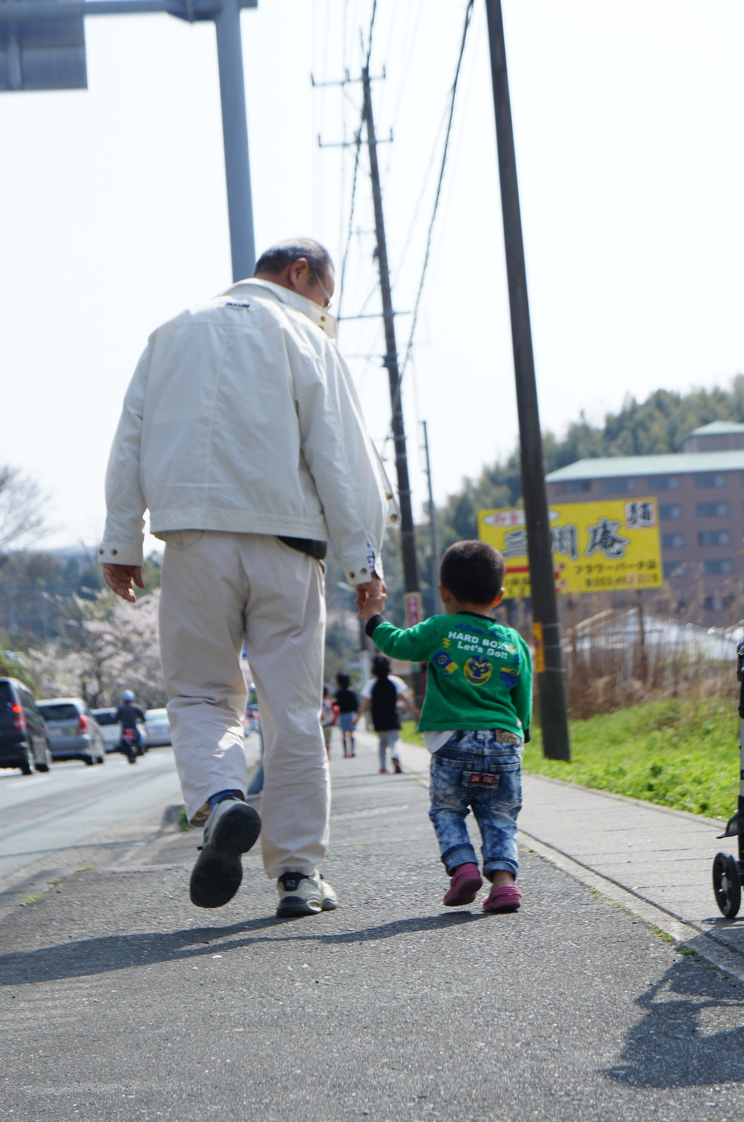 子供達と僕の両親を連れて、近所のフラワーパークへ歩いて向かうときの写真です。 僕の父と息子と手をつなぎ歩くなんて嬉しい