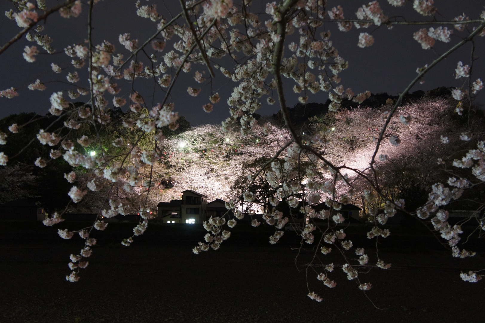 山一面の桜が、照らし出されて淡く光っています